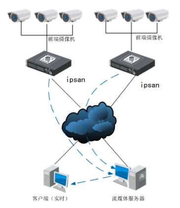 當多個客戶端需要同時查看某監(jiān)控點的相同畫面時,勢必會造成在一條通訊網絡線路上的數(shù)據擁堵,嚴重浪費網絡資源。監(jiān)控平臺軟件可以在有限的帶寬下,通過高效的流媒體轉發(fā)和流媒體級聯(lián)功能,保證音視頻流穩(wěn)定有效的傳輸,以及在不 同網段之間轉發(fā)媒體數(shù)據,實現(xiàn)被轉發(fā)媒體位置的透明性。當有多個客戶端需要同時訪問同一遠程畫面時,在轉發(fā)服務與前端視頻通道之間只占用一個通道帶寬的網絡資源,再由轉發(fā)服務器將數(shù)據分發(fā)給多個客戶端,解決了帶寬、內外網和多用戶訪問的沖突,有效地利用 網絡帶寬。流媒體服務器支持視音頻流的轉發(fā),當有多個局域網客戶端需要同時訪問同一遠程畫面時,可以通過流媒體服務器進行轉發(fā),在轉發(fā)服務與前端視頻通道之間只占用一個通道帶寬的網絡資源,再由轉發(fā)服務器將數(shù)據分發(fā)給多個客戶端。