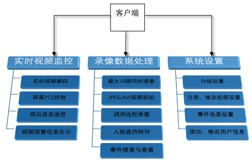 (3)客戶端實現(xiàn)實時監(jiān)控、認證訪問監(jiān)控所有現(xiàn)場設備,可以實現(xiàn)輪循預覽、電子地圖等功能。