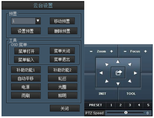 直接在視頻圖像上對攝像機的云臺、一體化球機等設備實現(xiàn)遠程控制:鏡頭變倍、調焦、云臺轉動(上下左右、定位預置點、巡航、調節(jié)速度、步進控制)等,操作方便,直觀。