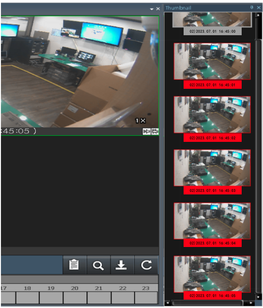 縮略窗口(在一個搜索窗口里):縮略圖能有效地看到每一秒(每一秒的第一幀)的圖像。它能還原第分鐘被丟掉的圖像。當你選擇其它攝像機時,它一樣能恢復。如果你點擊一個縮略圖時,它會顯示暫停。如果你想選擇你前一個時間點,雙擊縮略圖。一定時間間隔的縮略圖功能使得可以細分時間以識別事件發(fā)生時的確切時刻,對龐大存檔中的視頻進行搜索可以在幾秒鐘內完成,可以讓用戶自行設置不同的時間段(如按1小時、幾分鐘,甚至幾秒鐘)來對錄像資料進行搜索,大大減輕了工作人員的操作難度,提高工作人員的管理效率。